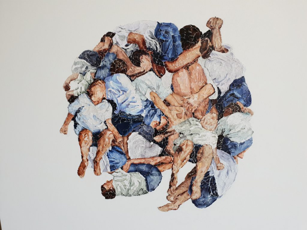 La “pittura” di Jimena, perché di pittura si tratta considerato il sapiente uso cromatico dei frammenti cartacei, pone davanti ai nostri occhi i suoi intimi fermi immagine e ci suggerisce di saltare, di contorcerci fino a scontrarci l’uno contro l’altro, di agire senza timori ma di farlo, proprio come sottolineano le dinamiche dei soggetti raffigurati.