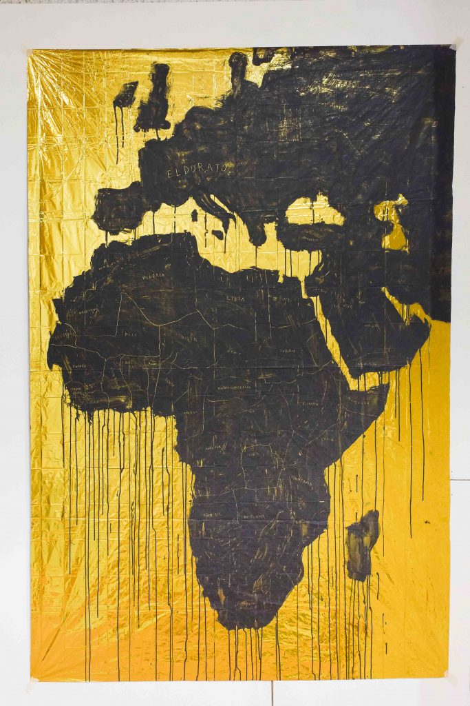 Il lavoro analizza il tema della terra promessa, la terra dell’oro, attraverso una serie di dipinti, in parte inediti, che utilizzano come supporto le coperte isotermiche, che hanno fatto parte del suo più ampio progetto di installazioni site-specific sui portali delle più importanti chiese e monumenti d'Italia.