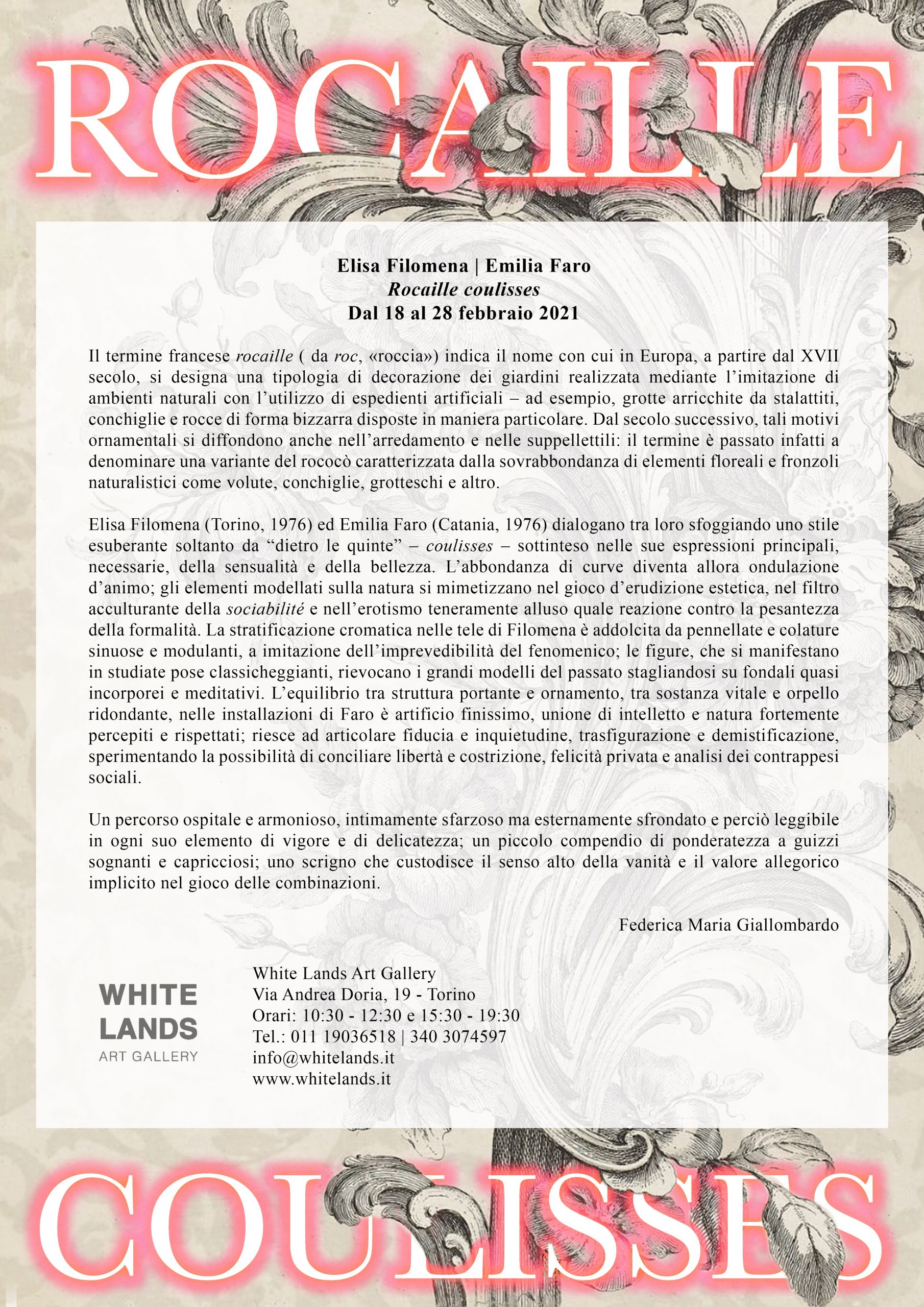 Elisa Filomena (Torino, 1976) ed Emilia Faro (Catania, 1976) dialogano tra loro sfoggiando uno stile esuberante soltanto da “dietro le quinte” – coulisses – sottinteso nelle sue espressioni principali, necessarie, della sensualità e della bellezza. Un percorso ospitale e armonioso, intimamente sfarzoso ma esternamente sfrondato e perciò leggibile in ogni suo elemento di vigore e di delicatezza; un piccolo compendio di ponderatezza a guizzi sognanti e capricciosi; uno scrigno che custodisce il senso alto della vanità e il valore allegorico implicito nel gioco delle combinazioni.