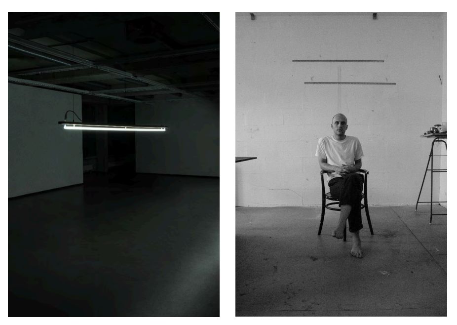 -- l’immagine con didascalia: Martin Sommer, F.L.A.V., 2023, lampada fluorescente riempita con gas estratto dall’aria di un caveau, cm 240x10x10. Ritratto dell’artista (per gentile concessione dell’artista)