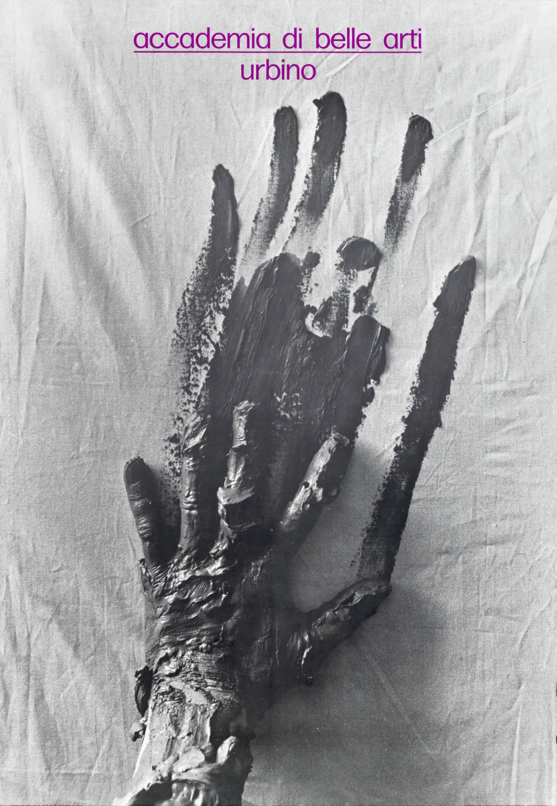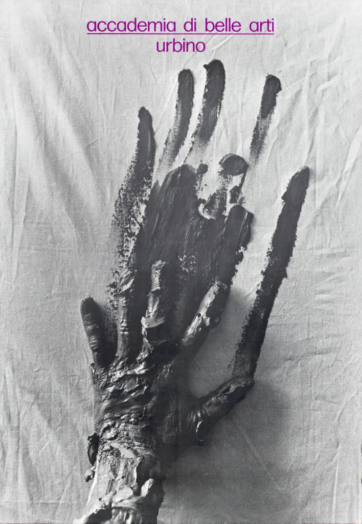In apertura della Galleria Adele Cappelli trovano posto una quindicina di manifesti di Massimo Dolcini (docente di Tecniche della Fotografia dal 1972 al 1984) che sono stati realizzati per promuovere le attività dell’Accademia. L’esteso arco temporale cui appartengono i manifesti, che datano agli inizi degli anni Sessanta fino alla fine degli anni Novanta, permettono di ripercorre l’excursus professionale di Dolcini, dalla sua adesione al Supergurppo proseguendo poi con lo studio di progettazione Fuorischema e l’agenzia Dolcini Associati. Oltre a uno stile inconfondibile, Dolcini promuoveva una cultura del progetto che doveva avere un approccio etico oltre che estetico; da qui l’anelito a una comunicazione condivisa, incentrata sulle relazioni e le reciproche contaminazioni. Particolarmente significativi sono i manifesti delle Iscrizioni all’Accademia di Urbino in quanto rispecchiano il “fare comune” vaticinato da Dolcini, a dimostrazione di come il Maestro collaborasse a stretto contatto con gli studenti.