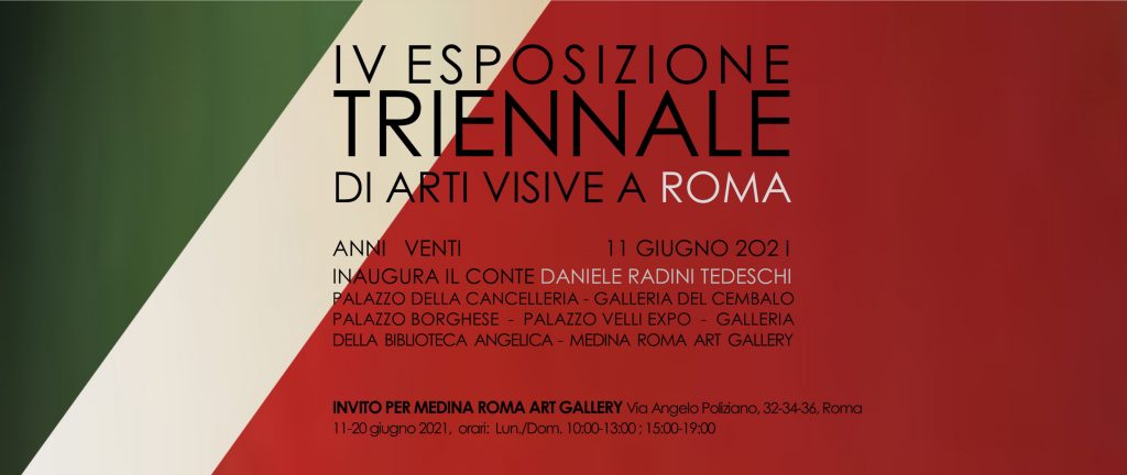 Roma riparte con la quarta edizione della Triennale di Arti Visive, dal titolo Global Change, Anni Venti, che si svolgerà a partire dall’11 giugno 2021. Sostenuta dal Gruppo Start, organizzazione che si occupa di editoria e mostre d’arte internazionali, con il patrocinio morale del Ministero dei Beni Culturali (per quanto riguarda la rassegna presso la Galleria della Biblioteca Angelica) in quest’edizione parteciperanno oltre duecento artisti italiani con trecento opere esposte in cinque spazi espositivi: Galleria del Cembalo – Palazzo Borgese (Largo Fontanella Borghese 19), Palazzo della Cancelleria (Piazza della Cancelleria 1), Galleria della Biblioteca Angelica (Piazza di S. Agostino 8) Palazzo Velli-Expò (Piazza di Sant’Egidio 10) Medina Rome Art Gallery (Via Angelo Poliziano 32-34-36).