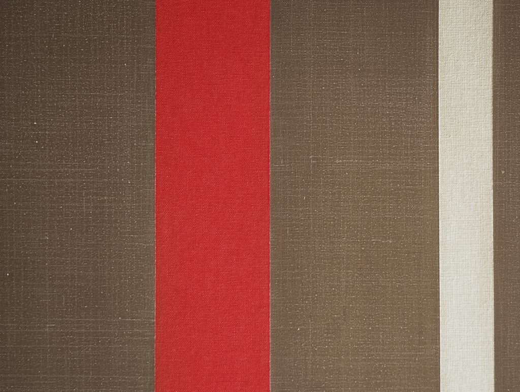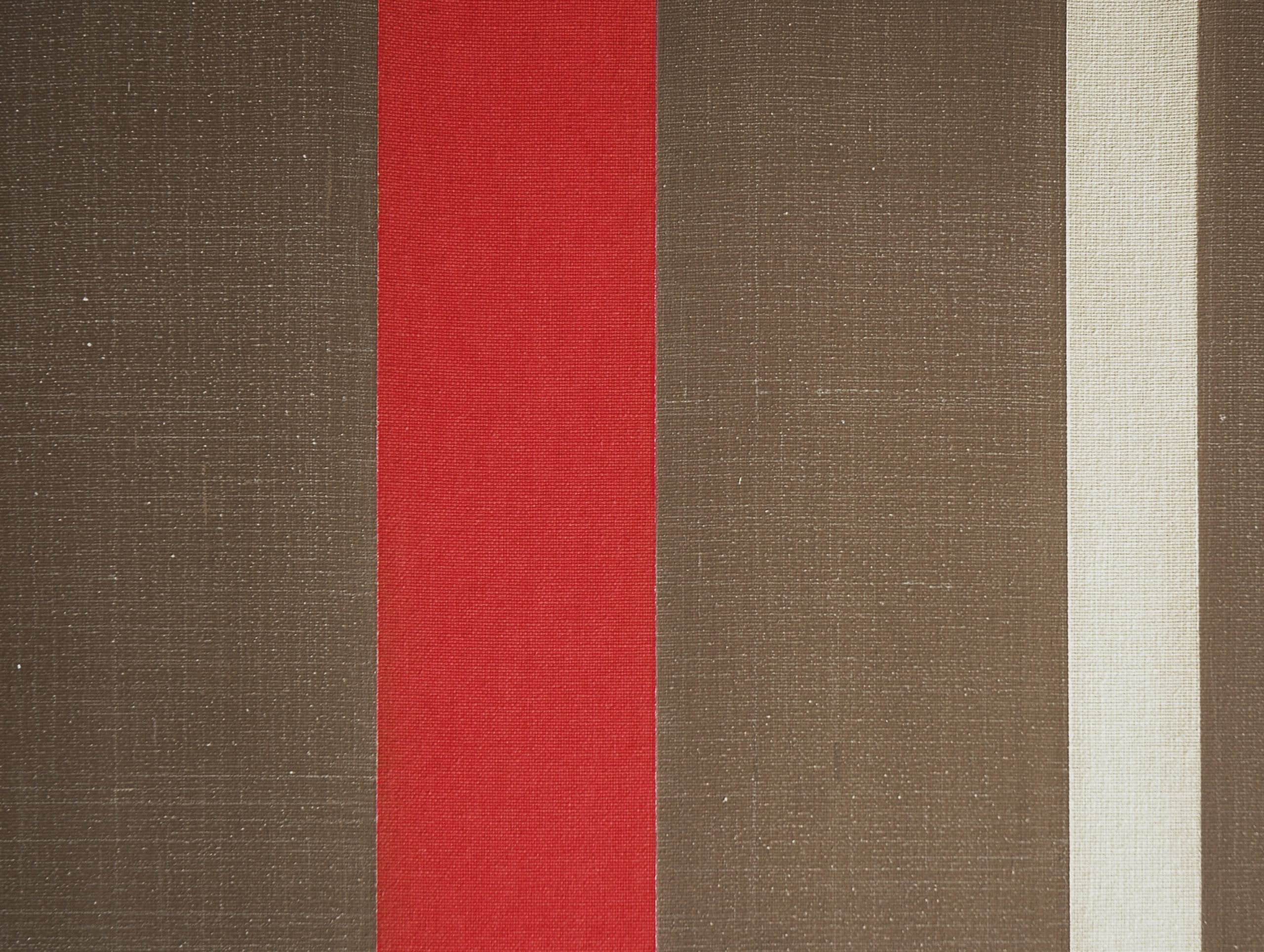 I dipinti più recenti e inediti infatti vedono la superficie di una stoffa industriale a righe dove alcune parti sono dipinte in trompe l’oeil ad imitazione della tela di lino, pittura che si interrompe in corrispondenza del motivo decorativo della riga stampata. A colpo d’occhio le zone dipinte del quadro sembrano le righe colorate, quando invece è il fondo, che sembra tela di lino grezza, ad essere la parte dipinta ed eseguita dall’artista.
