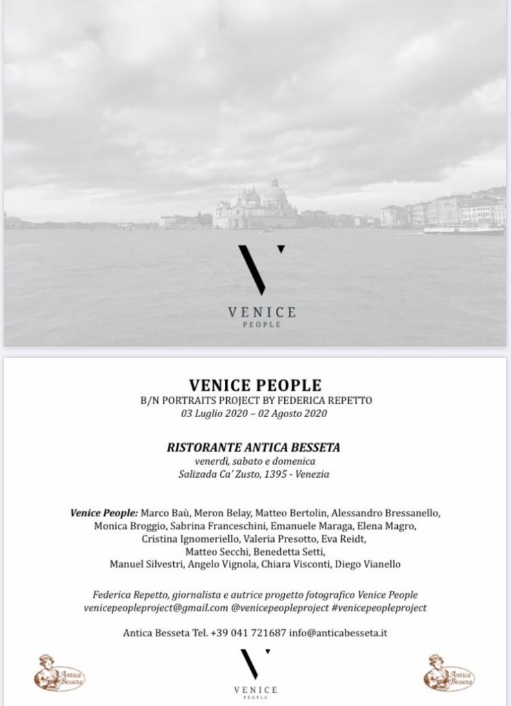 Volti di Venezia, storie legate alla città. 17+1 sono i ritratti fotografici di Federica Repetto, giornalista di formazione e che nel mezzo fotografico ha trasferito il gusto di raccontare storie. La mostra “Venice People B/N Portraits Project” è ospitata alla Antica Besseta (Salizada Ca’ Zusto, 1395, Venezia). La mostra è stata prorogata al 31 agosto 2020.