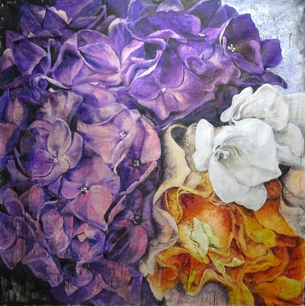 La mostra presenta una selezione di opere recenti dell’artista veneta, la cui ricerca è caratterizzata dal tema floreale. Sono infatti i fiori – spesso dipinti su tele di ampie dimensioni – i soggetti preferiti da Egle Piaser; fiori che hanno un carattere e posseggono una “personalità” propria e contraddistinta, come in una sorta di moderno animismo, dove l’elemento vegetale – personaggio protagonista- quasi si erge a presenza divina, degna di culto osservante. Se vogliamo, anche un sentito omaggio alla pittura floreale fiamminga, che tra il XVI e il XVII secolo ha un suo spazio nella storia dell’arte, e soprattutto nella tradizione olandese, citiamo l’autore più rappresentativo: Ambrosius Bosschaert. Bianchi opalescenti e gialli cromi, rossi vermigli e carmini, velature rosacee e azzurre, le tinte sembrano danzare in vorticose spirali, concentrando la nostra attenzione al centro dell’immagine. La bellezza cangiante dei colori e l’eleganza delle forme dei petali e del fogliame ci cattura, ci seduce e ci incanta in una sensualità emotiva che si potrae – in una sottintesa allusività delle forme – fino a condurci ad un raffinato erotismo.