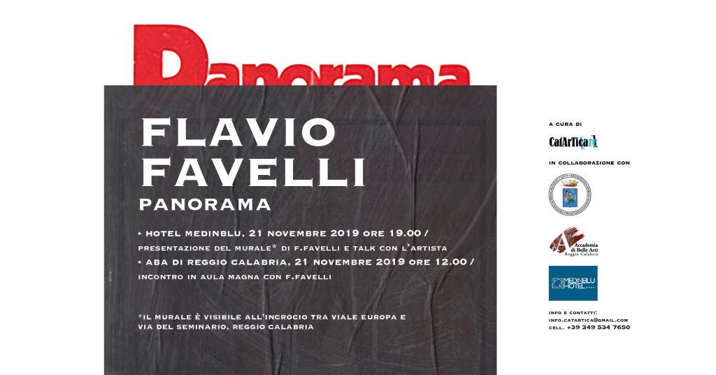 Giovedì 21 novembre 2019 presso l’Hotel MEDINBLU di Reggio Calabria, alle ore 19, sarà presentata l’opera murale che l’artista Flavio Favelli – tra i più riconosciuti e apprezzati artisti contemporanei italiani – realizzerà nella città calabrese che affaccia sullo Stretto. La presentazione dell’opera murale che l’artista regalerà alla città sarà anche una speciale e importante occasione di approfondimento generale dei concetti che stanno alla base del lavoro e della ricerca di Flavio Favelli, in particolare del suo peculiare approccio estetico e concettuale con lo spazio pubblico. Introduce la serata Alessio Laganà (direttore artistico del progetto Contenitore di idee – MEDINBLU), dialogherà con l’artista Valentina Tebala (storica dell’arte e curatrice, presidente di Catartica Care) con il contributo di Francesco Finotti (artista e docente ABArc) e l’intervento di Irene Calabrò (Assessore alla Valorizzazione del Patrimonio culturale del Comune di Reggio Calabria) e del Sindaco del Comune di Reggio Calabria, Giuseppe Falcomatà.