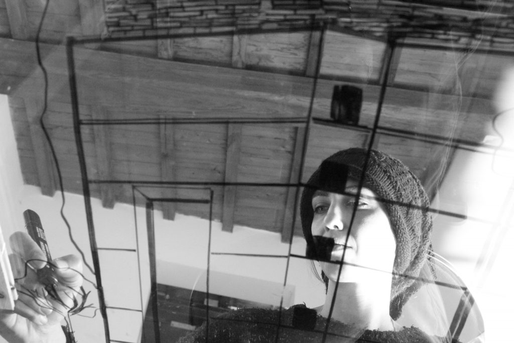 Dalle pareti pendono le opere incise da Alessia su lastre di vetro e incastonate in cornici di ferro battuto. La selezione, dal titolo HUMAN MECHANISM è stata sviluppata con la tecnica del Grattage che consiste nel grattare la vernice ancora fresca su diversi materiali .