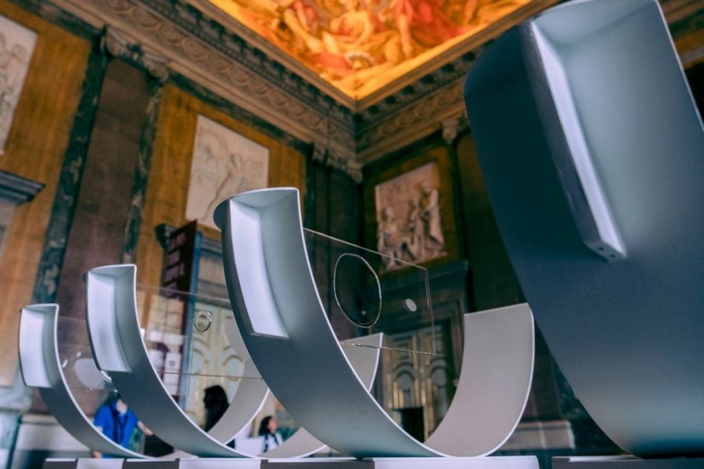 La Reggia di Caserta, cuore pulsante e vivo dell’opera vanvitelliana, è caratterizzata dalle meraviglie del parco con le sue fontane alimentate dall’acquedotto Carolino. Questo è il punto di congiunzione che apre una profonda riflessione e connessione con gli archi e i vetri di Flow. L’acqua diventa elemento che genera vita e movimento, mentre l’arco è un chiaro riferimento sia alla struttura architettonica dell’acquedotto, sia alla gabbia toracica, che nella scultura protegge il corpo vivo e fragile del cristallo, sinonimo degli organi vitali dell’opera. Mettere in relazione un progetto ingegneristico e architettonico con il pensiero poetico dell’installazione, è un modo per poter cogliere gli elementi che dal contemporaneo ci portano indietro, in un passato dove l’immaginazione si concretizzava nella realizzazione di grandi opere.