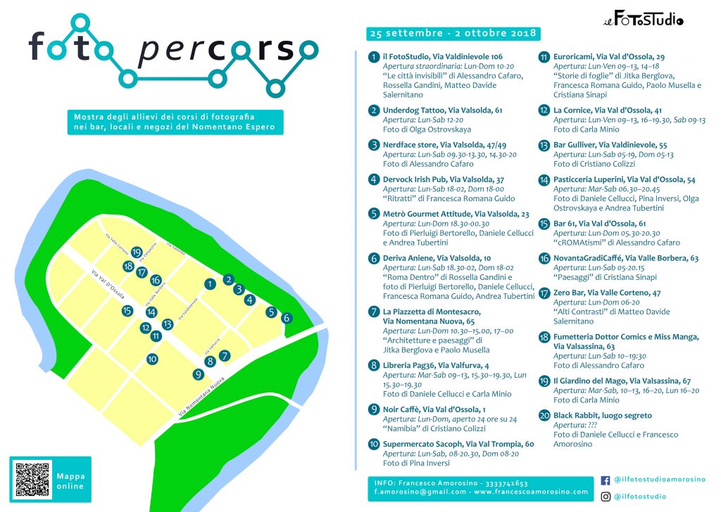La fotografia invade il quartiere Nomentano Espero, una penisola circondata dal fiume Aniene vicino piazza Sempione, grazie all’evento “Foto percorso”. Bar, locali e negozi dal 25 settembre al 2 ottobre ospiteranno gli scatti degli allievi dei corsi de il FotoStudio, lo spazio gestito dal fotografo Francesco Amorosino che si trova proprio in quel quartiere.