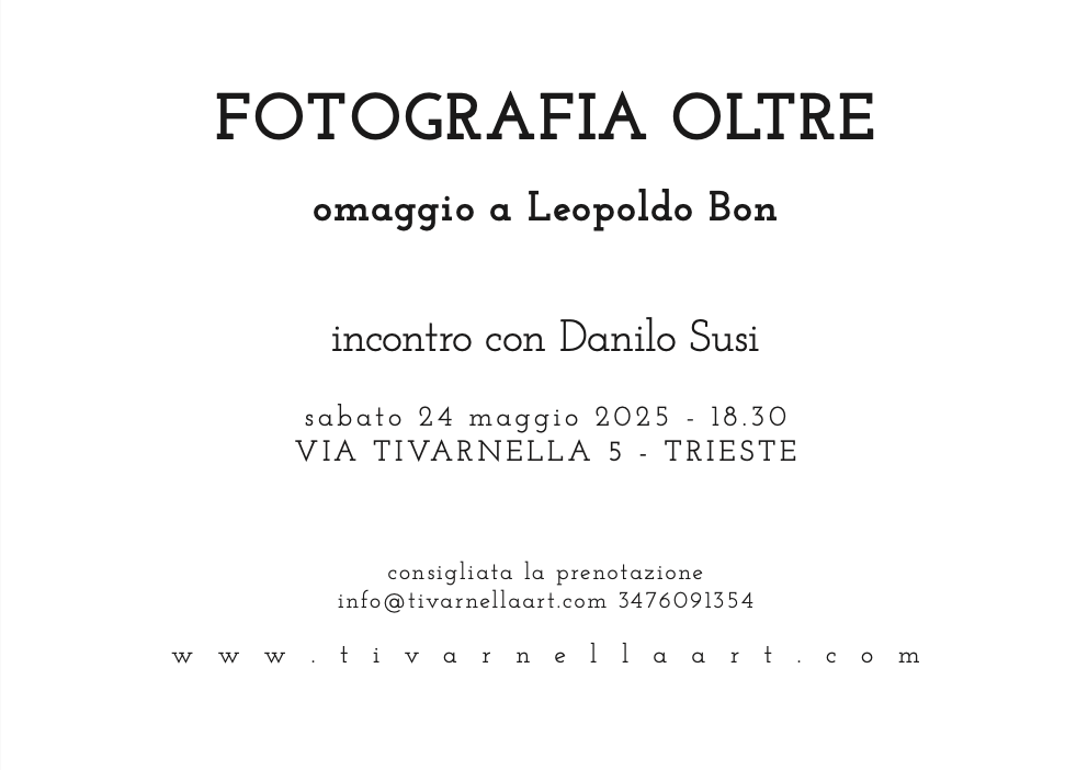 Sabato 24 maggio 2025 Tivarnella Art Consulting ospita la conferenza evento dell’artista Danilo Susi, in omaggio al fotografo triestino Leopoldo Bon. L’allontanarsi dalla figurazione è un tratto che unisce la produzione artistica di entrambi: Bon, rifacendosi alla neurofisiologia, ha reso lo strumento fotografico un mezzo per intercettare elementi visivi che normalmente rifuggono l’occhio umano, innescando così stimolazioni mentali consce ed inconsce nella mente dell’osservatore.