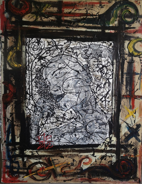 In mostra circa 15 opere, alcune anche di formati imponenti, com’è d’uso dell’artista che in questa sua prima personale romana, strizza l’occhio anche al riuso e al riciclo, così in voga e oltre alla classica juta, si cimenta anche sul cartone e su altri materiali di scarto, mescolando con l’acrilico.