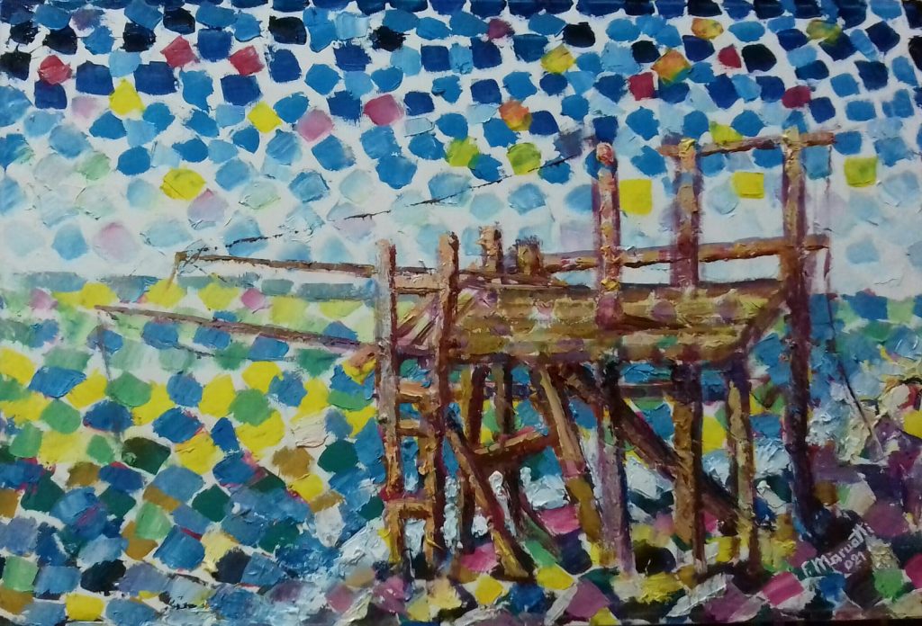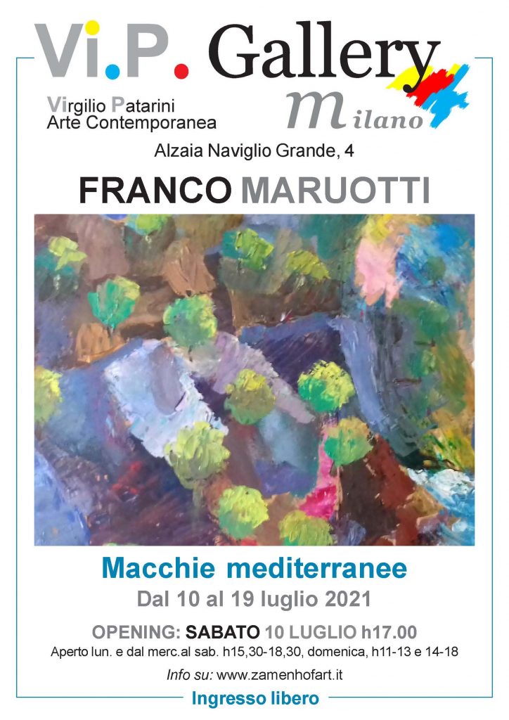 Si inaugura sabato 10 luglio 2021, alle ore 17,00, alla Vi.P. Gallery di Milano, in Alzaia Naviglio Grande, 4, la mostra personale del pittore Franco Maruotti intitolata, con un gioco di parole tra soggetti dipinti e tecnica pittorica, “Macchie Mediterranee”, che presenta una ventina di lavori dell’artista pugliese, tutti dedicati a scorci tipicamente mediterranei: colline, vigneti, uliveti, trabucchi sul mare, paesini del Gargano… dipinti con un uso della spatola che richiama a tratti le larghe pennellate di Cezanne. La superficie pittorica viene scandita da una serie più o meno fitta di piccole “macchie” colorate che scompongono e ricompongono la visione.