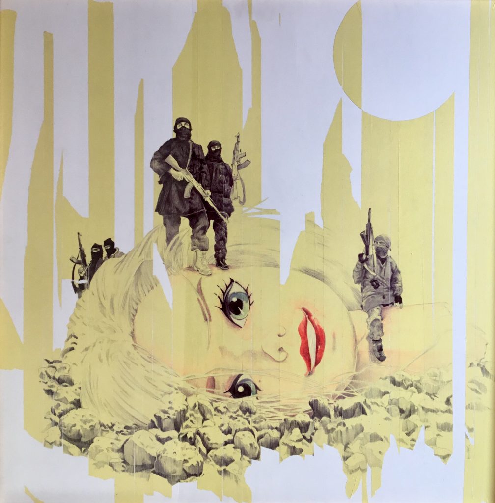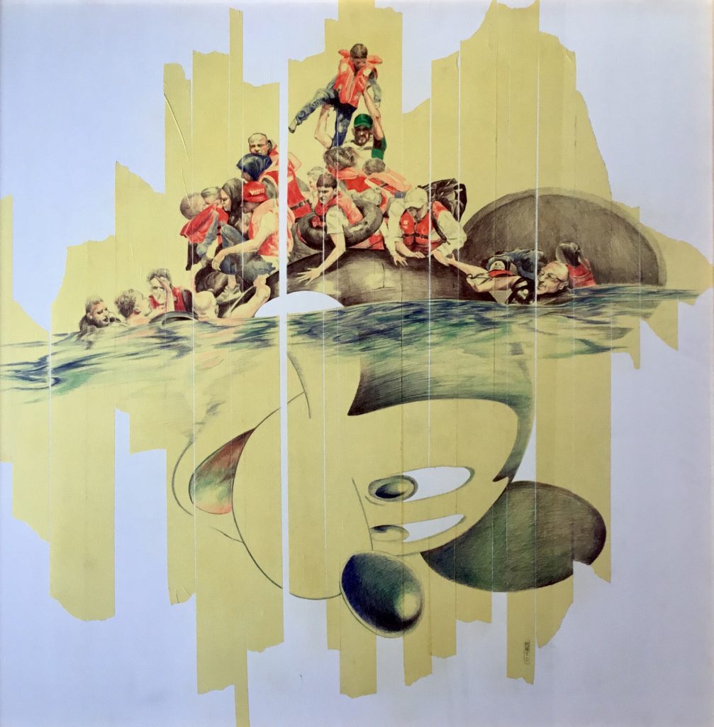 Nella serie “Toy Story” 1, 2, 3, ad immagini di grosse icone di giochi della sua/nostra infanzia (Mickey Mouse, Barbie, supereroi …) vengono accostate immagini di scene di lotte e rivoluzioni contemporanee: Mickey-mouse diventa àncora di salvezza” per chi fugge dalla guerra, per chi si arrampica per raggiungere il mondo occidentale, chi per viverci e chi per distruggerlo, Barbie-girl corrisponde ad una minaccia, quella dell’emancipazione femminile nei paesi integralisti islamici e simbolo da abbattere, Bat-mobile rappresenta i nuovi casseurs che si battono contro il capitalismo, la globalizzazione e i simboli dello status americano mirando all’annientamento dei super eroi.