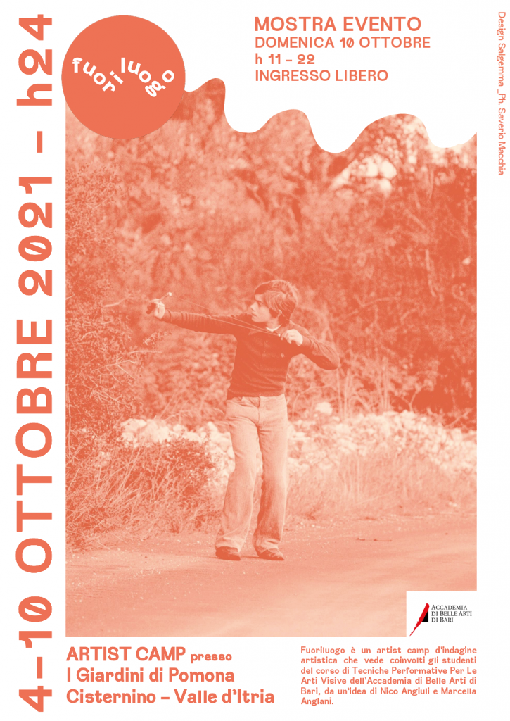 tutoraggio dell’artista Corinne Mazzoli. Una residenza e mostra evento, con giornate aperte al pubblico, che vede coinvolti gli studenti del corso di Tecniche Performative Per Le Arti Visive tenuto da Nico Angiuli all’Accademia di Belle Arti di Bari.