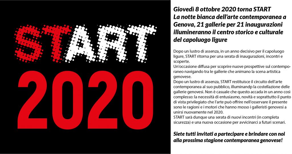 Dopo un lustro di assenza, START restituisce il circuito dell'arte contemporanea al suo pubblico, illuminando la costellazione delle gallerie genovesi. Non è casuale che questo accada in un anno così complesso: la necessità di entusiasmo, novità e soprattutto il punto di vista privilegiato che l'arte può offrire nell'osservare il presente sono le ragioni e i motori che hanno mosso i galleristi genovesi a unirsi nuovamente nel 2020. START sarà dunque una serata di nuovi incontri (in completa sicurezza) e l' occasione per avvicinarci a futuri scenari.