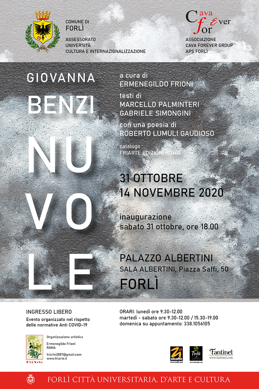 Giovanna Benzi "Nuvole". Sabato 31 ottobre, alle ore 18.00, Palazzo Albertini (Sala Albertini, Piazza Saffi, 50) verrà aperta al pubblico la mostra “Nuvole” di Giovanna Benzi. La mostra, a cura di Ermenegido Frioni, con testi in catalogo di Marcello Palminteri, Gabriele Simongini e una poesia di Roberto Lumuli Gaudioso, è organizzata da Friarte-Roma, con la collaborazione dell’Associazione Cava Forever Group e con il patrocinio del Comune di Forlì. Fino al 14 novembre.