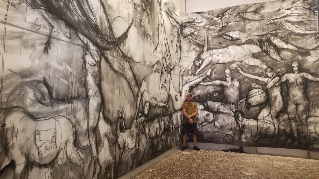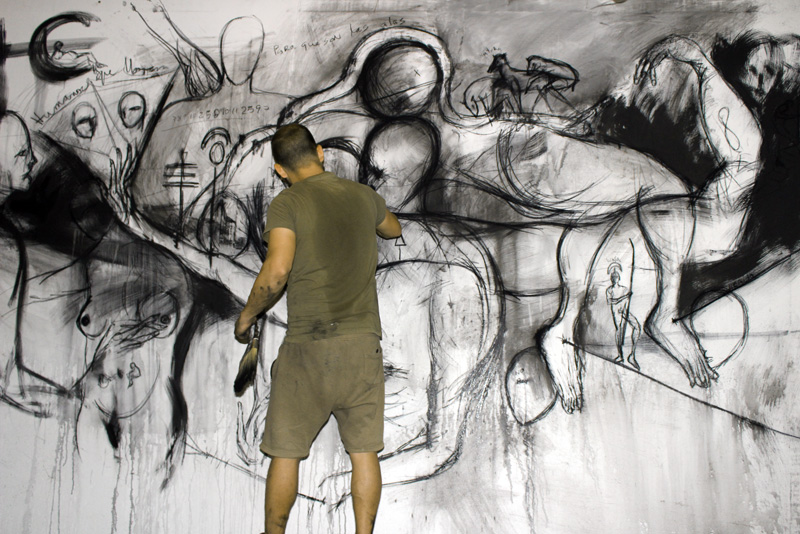 Sulle pareti della galleria, a tutta altezza, Delgado propone la sua versione personale del michelangiolesco Giudizio Universale.
