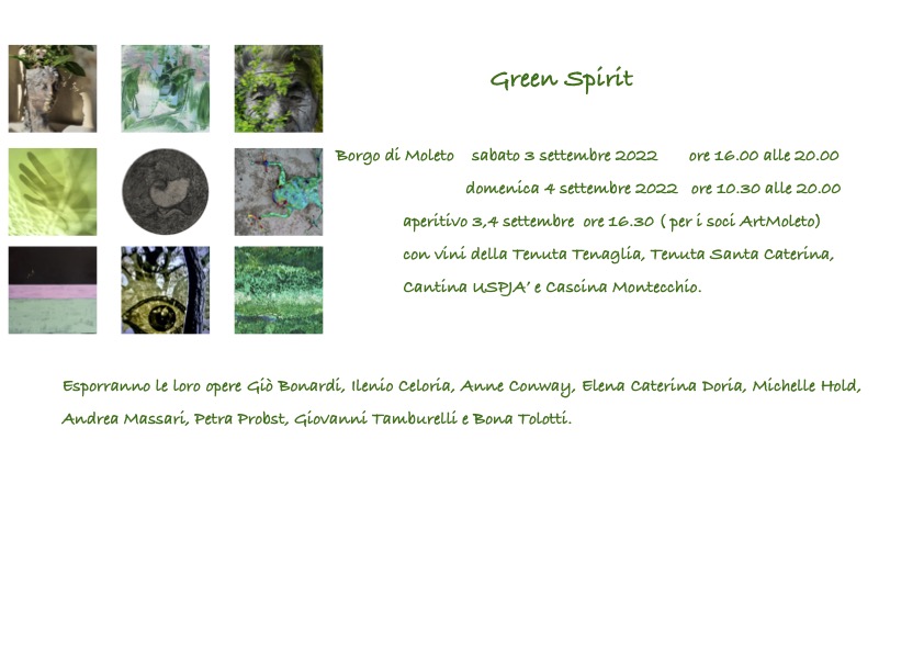 Il 3 e il 4 settembre 2022 il Borgo di Moleto torna a riempirsi di bellezza. Gli artisti di ArtMoleto organizzano ‘Green Spirit - Living with Art’, una collettiva che animerà le vie del piccolo borgo. L’arte contribuisce a questo processo con la riflessione condivisa che, attraverso il dialogo tra colore e forma, consente a chi osserva di entrare in contatto con la parte più dinamica dell’universo.
