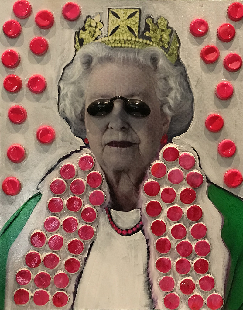 Si prosegue quindi con la “Fluo Queen” dell’italiano Fabio Ferrone Viola, in cui la sovrana è raffigurata in pieno stile pop. Ferrone Viola è molto attento al recycling e nelle sue opere materiali di scarto o in disuso tornano a nuova vita diventando elementi essenziali ed imprescindibili dall’arte. Queen Elizabeth è realizzata in vernice acrilica su tela utilizzando tappi di bottiglia, mentre gli occhiali da sole in plastica a schermarne gli occhi, conferiscono all’opera un carattere giocoso ed ironico, come solo il pop sa fare.