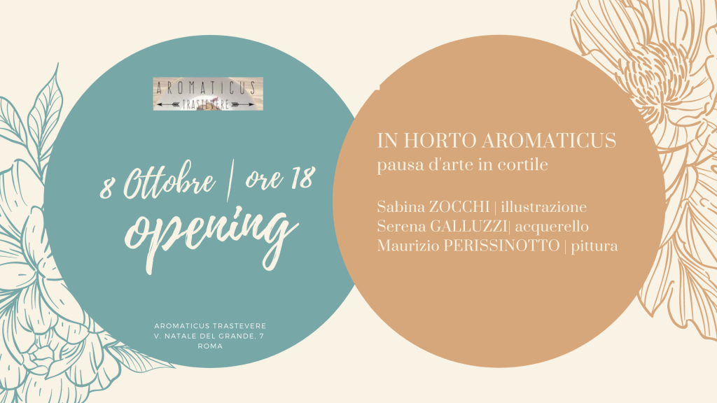 Nel cuore di Trastevere, un’oasi nascosta, il cortile di Aromaticus di Luca e Francesca, ospiterà tre inedite esposizioni d’arte che si concluderanno con la Roma Art Week il 27 | 31 ottobre. Tre esposizioni di artisti i cui lavori dialogheranno con gli spazi di ispirazione vagamente esotica e le piante aromatiche custodite nel green bistrot di via Natale del Grande.