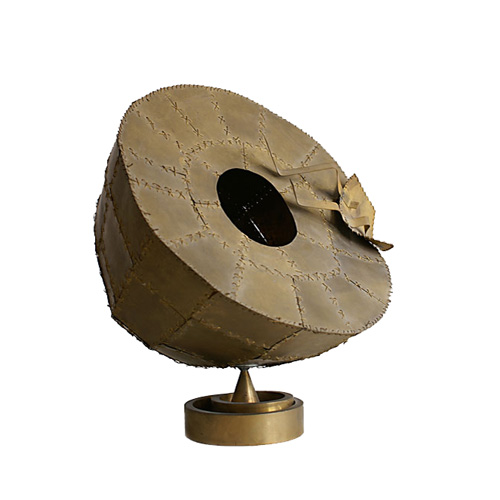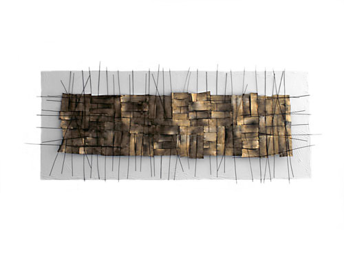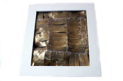 La serie TRAME, ha come focus la tessitura del metallo. La filosofia della croce, considerata nella sua eccezione di simbolo ancestrale, si esprime anche nella manifestazione di trama e ordito, questo intreccio, rappresentativo del legame tra l’umano e lo spirituale, è espresso nel gesto antico e sapiente del tessere, creando una texture primitiva. Gli oggetti metallici di colore giallo oro, vogliono rappresentare il sacro nel profano.