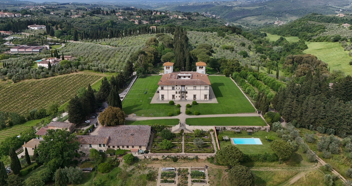 Villa Le Corti sorge nella zona settentrionale del Chianti Classico, sulla dorsale che divide le valli dei fiumi Greve e Pesa, affacciata su un paesaggio di vigneti, uliveti e boschi.