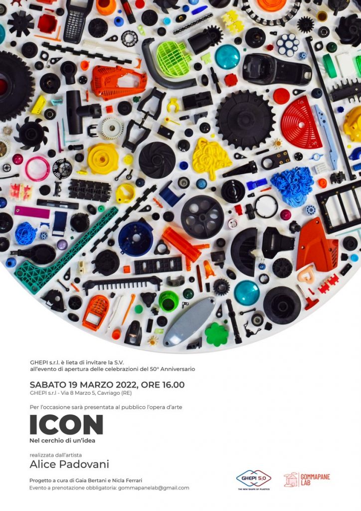 Le celebrazioni per il 50° Anniversario di Ghepi s.r.l. si aprono ufficialmente sabato 19 marzo 2022, alle ore 16.00, con la presentazione dell'opera "Icon. Nel cerchio di un'idea", realizzata dall'artista modenese Alice Padovani nel corso di una residenza d'artista organizzata dall'Associazione culturale Gommapane Lab presso la sede aziendale. Richiesta la prenotazione.