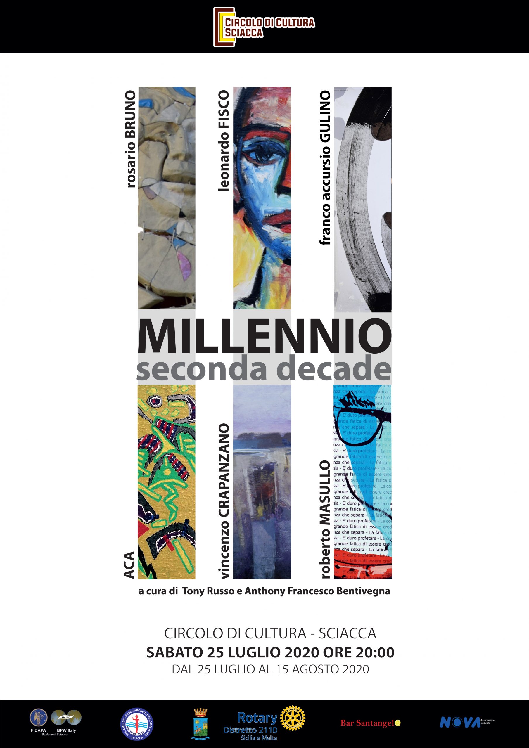 Si inaugura sabato 25 luglio 2020, alle ore 20:00, presso il Circolo di Cultura di Sciacca, la collettiva dal titolo III MILLENNIO. SECONDA DECADE – GENERAZIONI A CONFRONTO. L’iniziativa, a cura di Tony Russo e Anthony Francesco Bentivegna, è promossa dal Circolo di Cultura di Sciacca.