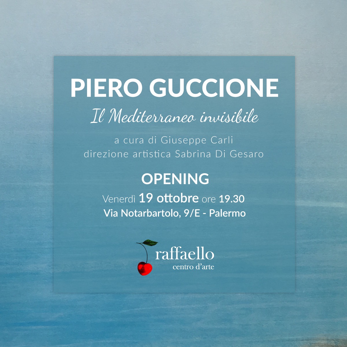 Una nuova sede, una mostra imperdibile. Dopo trent'anni di attività il Centro d'arte Raffaello inaugura venerdì 19 ottobre, ore 19:30, la sua seconda sede (via Notarbartolo 9/e – 90141 - Palermo) con la mostra a cura di Giuseppe Carli “Il mediterraneo Invisibile”, del maestro Piero Guccione. Grazie alla visione della gallerista Sabrina Di Gesaro la nuova apertura si pone l'obiettivo di fornire un punto di riferimento per tutte le persone che credono fortemente nello sviluppo e nella crescita culturale della città, dando alla stessa una nuova direzione più contemporanea, al passo con i tempi.