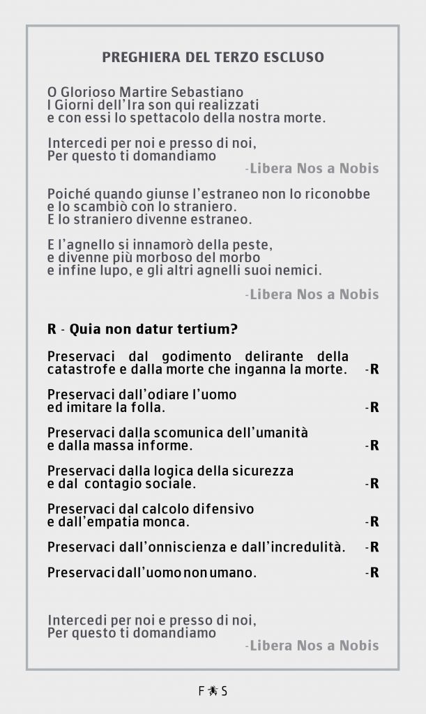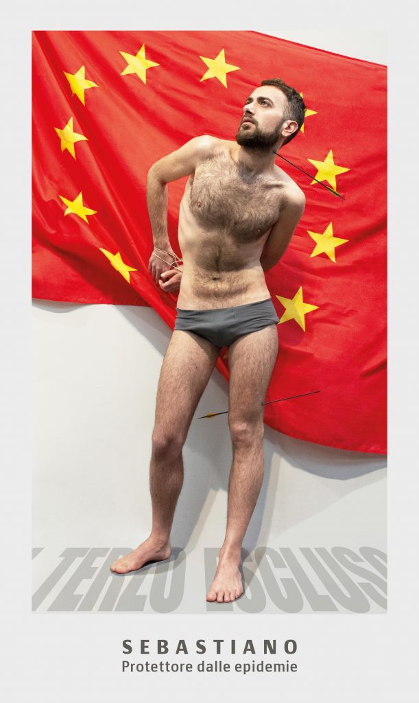 #sebastian è la terza e ultima fase in cui Sebastiano, protettore dalla peste e dalle epidemie, diventa manifesto politico sotto forma di santino religioso, la cui preghiera è un’invocazione rivolta agli uomini affinché ritrovino se stessi ricercando una “terza possibilità” all’interno della lotta convivenza fra gli estremi per prevenire il contagio sociale anti-sociale.