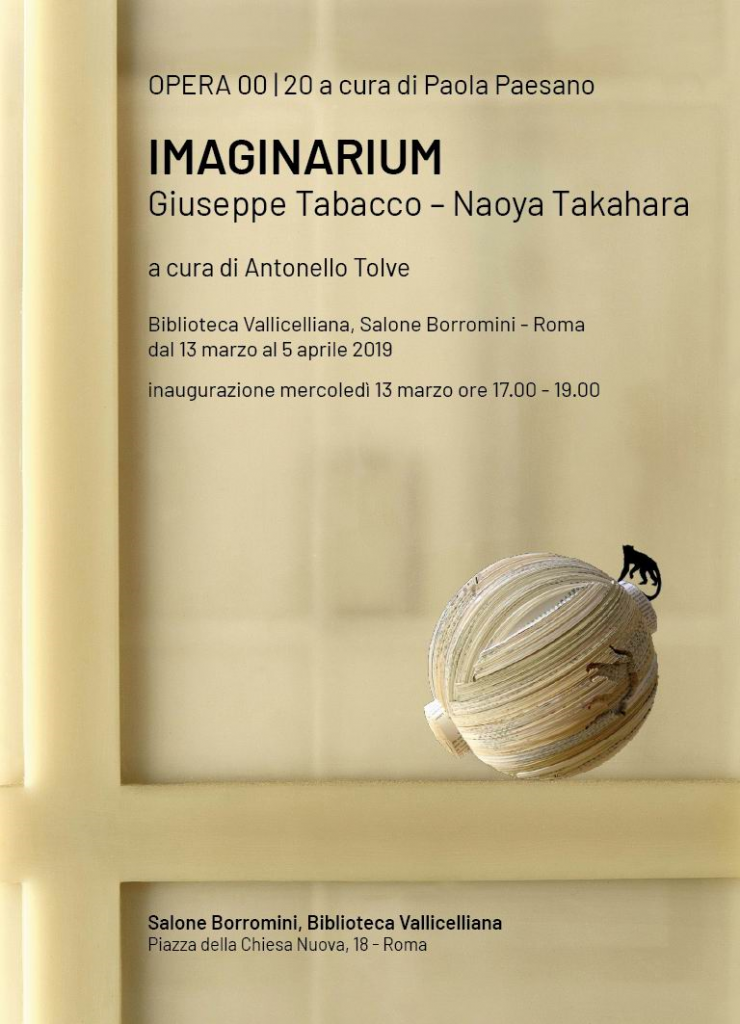 Imaginarium, la doppia personale di Giuseppe Tabacco e Naoya Takahara, a cura di Antonello Tolve, si presenta come un momento di riflessione sul lavoro di due artisti che da angolazioni differenti sentono l’esigenza di misurarsi con un ambiente caratterizzato dal sapore del sapere, dalla via lattea di una conservazione, di una catalogazione che è storia e memoria, riflessione e materia.