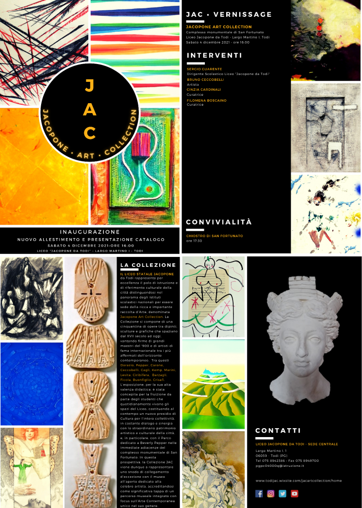 Sabato 4 dicembre alle ore 16, nella sede del “Liceo Statale Jacopone da Todi” presso il complesso monumentale di San Fortunato a Todi (PG), sarà inaugurata la collezione permanente JAC (Jacopone Art Collection). Composta in parte da opere storicamente appartenenti al Liceo fin dalla sua fondazione, in parte da acquisizioni che si sono susseguite dagli anni ’90 del secolo scorso in poi grazie a donazioni di privati cittadini, degli autori stessi o dei loro eredi, questa prestigiosa raccolta d’arte vanta firme di grandi maestri del Novecento e di artisti di fama internazionale tra i più affermati dell’orizzonte contemporaneo.