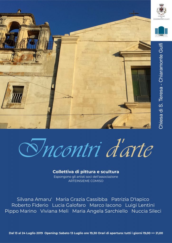 Mostra collettiva di pittura e scultura a Chiaramonte Gulfi. L’ex chiesa di santa Teresa ospiterà, dal 13 al 24 luglio, la mostra “Incontri d’arte”, organizzata da Arteinsieme. La piccola chiesa settecentesca, restaurata di recente ed utilizzata ora come sala espositiva, sarà la sede della mostra di un gruppo di artisti dell’associazione culturale con sede a Comiso (ne fanno parte artisti di vari comuni iblei). Espongono: Silvana Amarù, Maria Grazia Cassibba, Patrizia D’Iapico, Roberto Fiderio, Lucia Galofaro, Marco Iacono, Luigi Lentini, Pippo Marino, Viviana Meli, Maria Angela Sarchiello, Nuccia Sileci. La mostra sarà inaugurata il 13 luglio alle 19,30. Resterà aperta fino al 24 luglio, tutti i giorni, dalle 19 alle 21.
