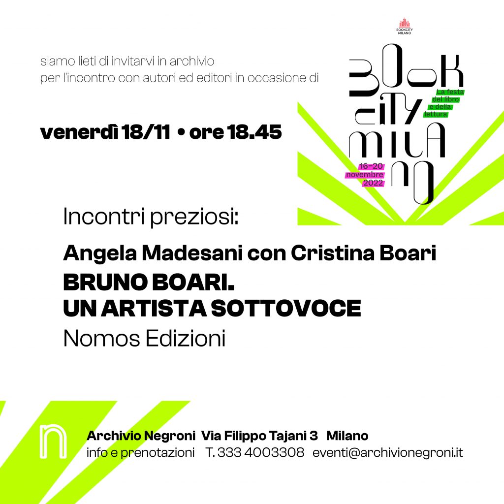 In occasione di Bookcity Milano in Archivio Negroni, l'incontro prezioso con la storica dell’arte Angela Madesani, autrice della monografia su Bruno Boari.Un artista sottovoce per Nomos Edizioni, ci svela l’opera dello scultore e medaglista, percorrendone la storia umana e artistica in pieno novecento. Artista da scoprire, attraverso l’analisi attenta che ne propone l’autrice e per l’occasione qui in archivio ne conversa con la nipote, Cristina Boari.