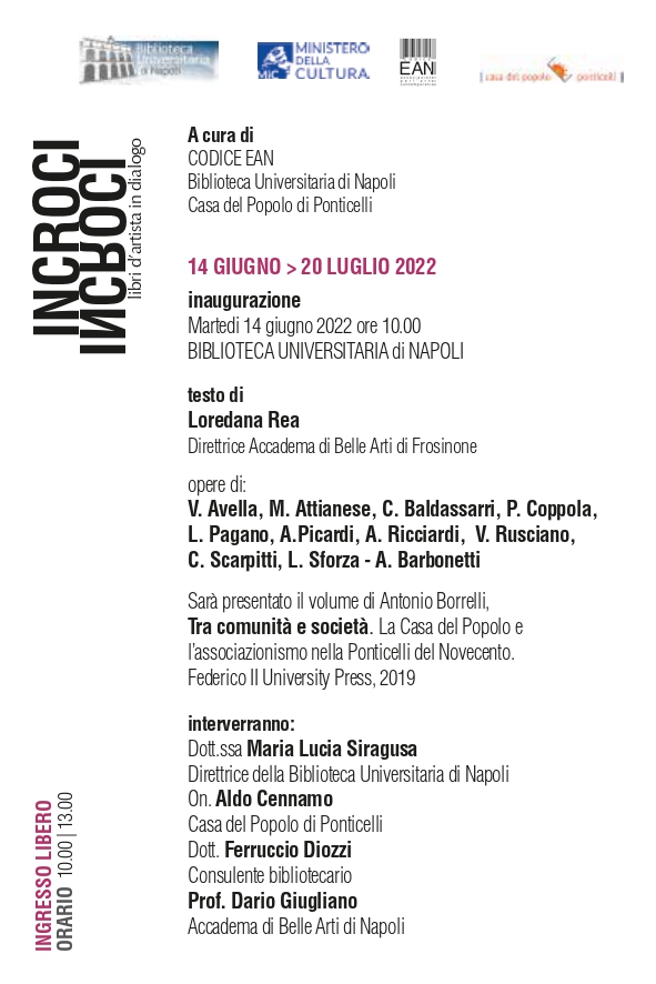 Martedì 14 giugno 2022, ore 10.00, presso la Biblioteca Universitaria di Napoli, si inaugura la mostra: “Incroci. Libri d’artista in dialogo”.