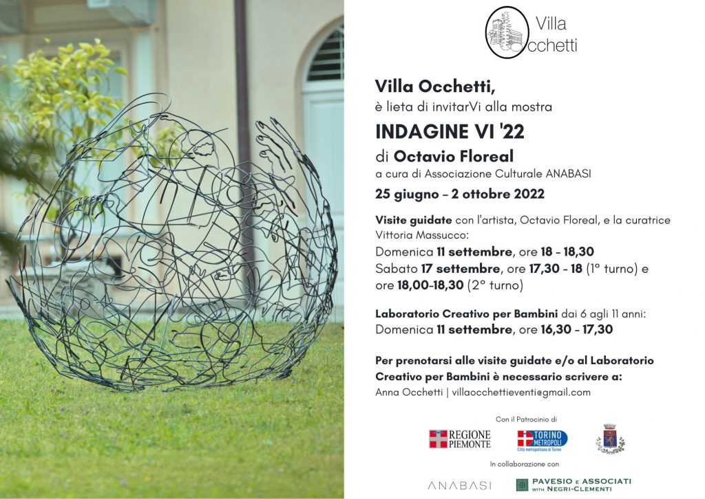 All’interno del parco della prestigiosa Villa Occhetti, storica residenza situata a Mazzè, inaugura INDAGINE VI ’22, mostra scultorea a cielo aperto di Octavio Floreal a cura dell’Associazione Culturale ANABASI e con il supporto del team arte di Pavesio e Associati with Negri-Clementi. La mostra – patrocinata dalla Regione Piemonte, dalla Città Metropolitana di Torino e dal Comune di Mazzè – è visitabile tutti i fine settimana o su appuntamento fino a domenica 2 ottobre 2022.