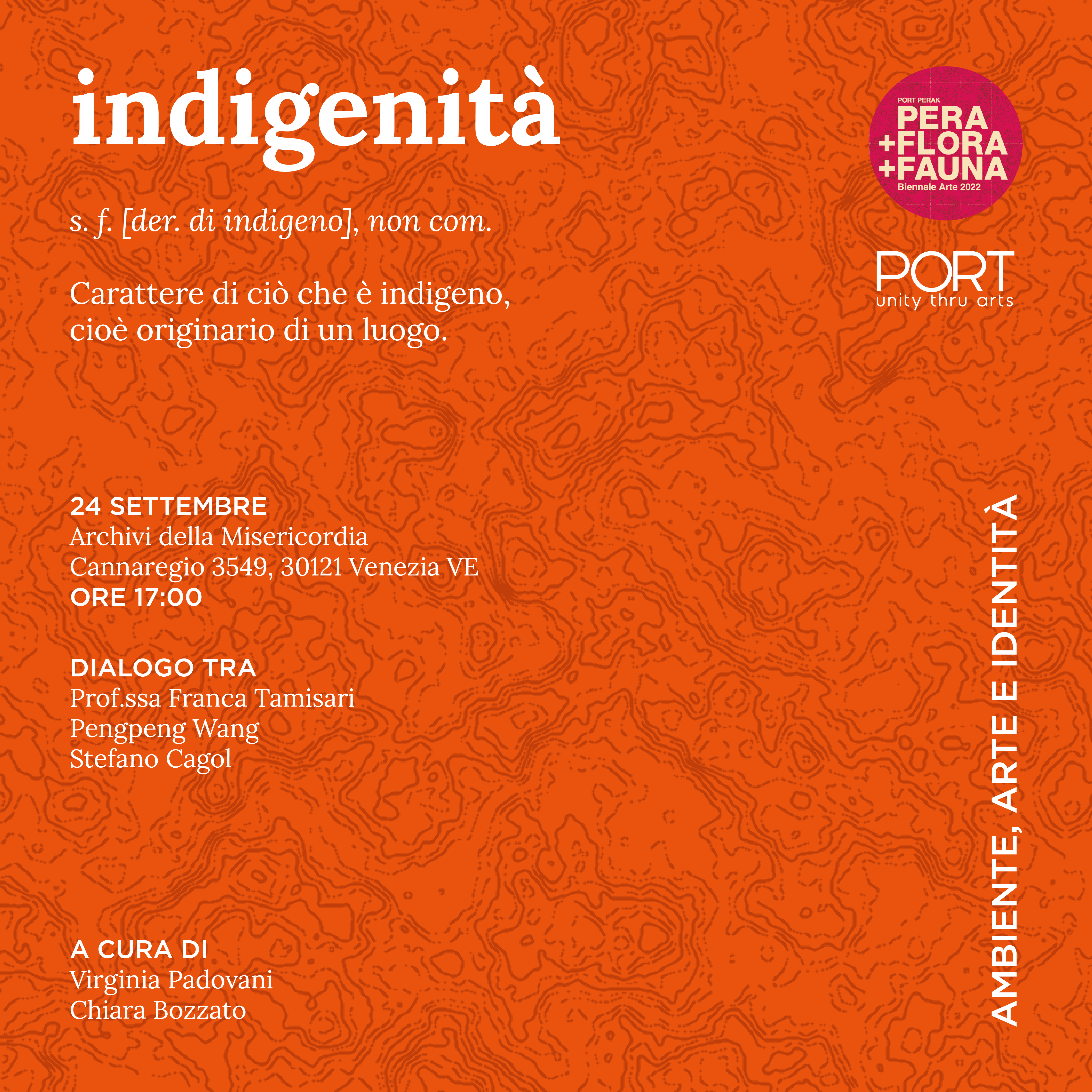 Il 24 settembre 2022 alle ore 17, presso gli Archivi della Misericordia (Fondamenta de l'Abazia, 3548, Venezia), si terrà il talk curato da Chiara Bozzato e Virginia Padovani “Indigenità. Dialogo tra arte, ambiente e identità”, nell’ambito di Pera+Flora+Fauna, evento collaterale della 59. Mostra d’Arte Internazionale di Venezia organizzato da PORT, agenzia culturale dello stato di Perak, Malesia.