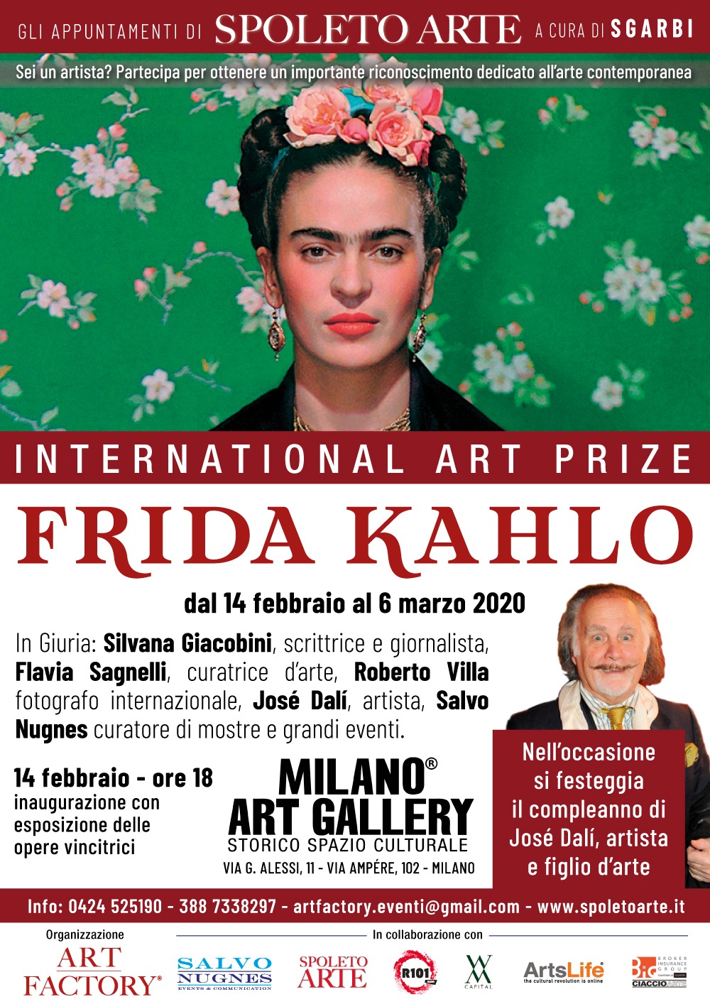 “Hanno pensato che fossi una surrealista, ma non lo ero. Non ho mai dipinto sogni. Ho dipinto la mia realtà” affermava Frida Kahlo. A quest’artista, emblema di un fare arte unico e intenso, di una femminilità tanto sofferta quanto vissuta liberamente, Milano Art Gallery dedica un premio. Un appuntamento di Spoleto Arte a cura di Vittorio Sgarbi. L’International Art Prize Frida Kahlo verrà assegnato a tutti quegli artisti meritevoli che avranno l’onore di esporre nella storica galleria, da cinquant’anni centro della vita culturale e artistica milanese. L’inaugurazione della mostra avrà luogo alle 18 di venerdì 14 febbraio in via Alessi 11, a Milano. Le opere resteranno esposte qui e nella sede in via Ampère 102 (sita in zona piazzale Loreto) fino al 6 marzo.