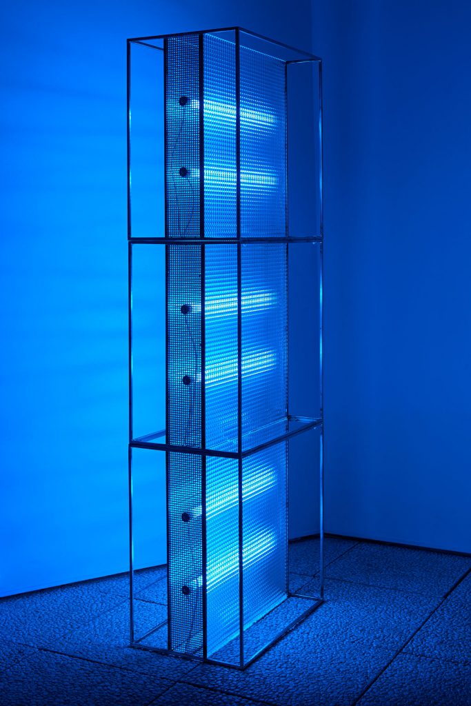 La ricerca di Toussaint si sviluppa tra arte e design, espressioni distinte ma intimamente connesse da un pensiero che giustappone libertà creativa e funzionalità, poesia e razionalità. Su queste basi il suo lavoro artistico, che si muove nell’ambito rigoroso della geometria e vive della composizione di segmenti (e, a volte, di archi) fatti ora di materia ora di puri segni di luce, prende forza da una vera immersione nello spazio, che ne diventa parte integrante in forza dell’utilizzo di luci neon blu che generano una intrigante atmosfera. Apprezzabile appare anche il superamento della staticità della geometria con un gioco di simmetrie e asimmetrie dalle felici valenze dinamiche.