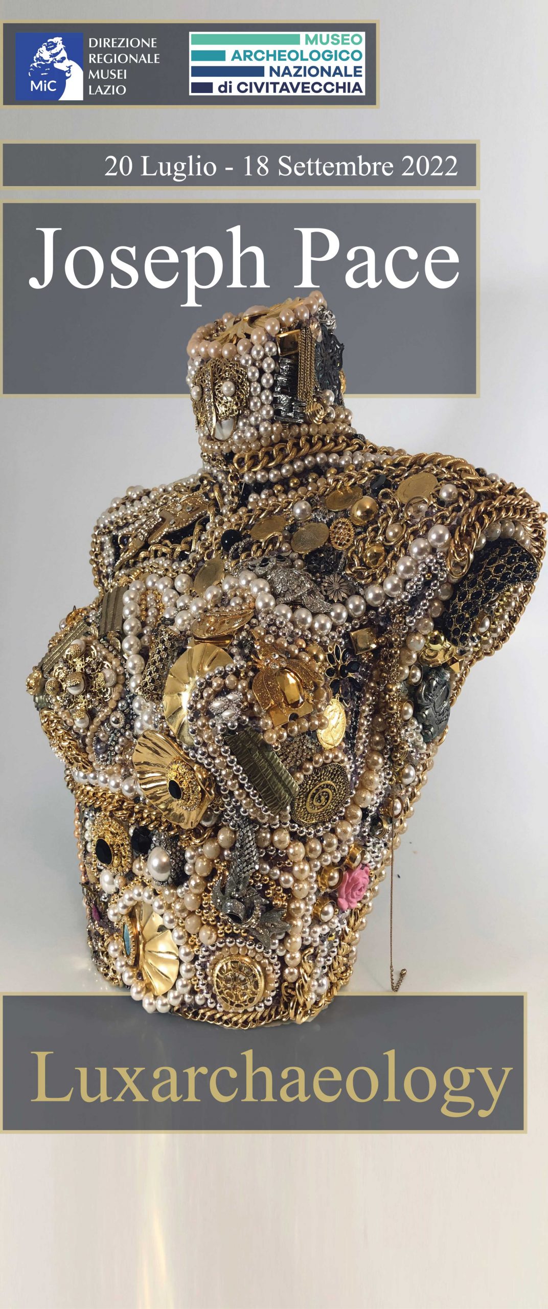 Dal 19 Luglio 2022 al 18 Settembre 2022, il Museo Nazionale Archeologico di Civitavecchia inaugura Joseph Pace, Luxarcheology una mostra di sculture realizzate con scarti industriali di gioielli dall’artista anglo-italiano Joseph Pace. La mostra segna una nuova tappa nella storia del Museo Archeologico Nazionale di Civitavecchia.