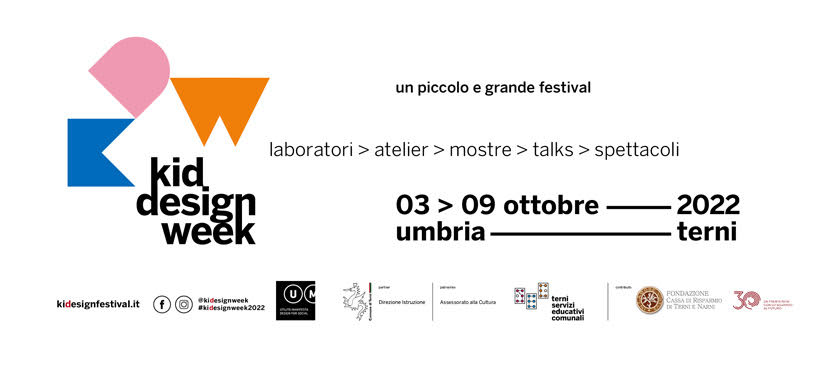 Torna a Terni, in Umbria, dal 3 al 9 ottobre 2022, “Kid Design Week” il festival della creatività per grandi e bambini. Disegno, musica, pensiero, scrittura, movimento saranno spunti per una settimana densa di appuntamenti che creano relazioni inedite tra l'individuo e l'idea di esperienza, a partire da riflessioni di ampio respiro sul segno grafico del bambino. La seconda edizione vede il tema delle “libertà” come tematica centrale dei laboratori, dei talks, degli atélier e dei momenti formativi del programma e stringe importanti collaborazioni con realtà del territorio nazionale: tra queste il collettivo di artisti “Mook”, l’Associazione “Parole O_Stili”, giovani artisti emergenti.