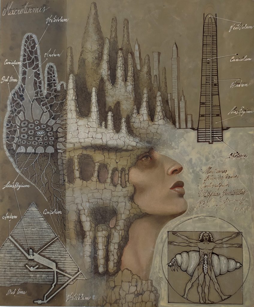 Vi sono animali che vivono in società organizzate, dove ogni individuo ha un ruolo prestabilito e lavora per il bene comune: le termiti, le formiche, le api... no, inutile cercare l'uomo nell'elenco, l'uomo non sa ragionare in termini di sacrificio personale, bene comune, crescita collettiva... Tanto meno lo sanno fare i politicanti di mestiere. Vania Elettra Tam ha un dono raro: sa vedere oltre la barriera dei comunicati ufficiali, sa cogliere la realtà del momento, spesso volutamente offuscata e, ancor più, sa intuire ciò che sarà, attraverso l'infallibile sfera di cristallo della sua arte. Così, fluttuando tra lo stato onirico, la razionalità e la creatività, Vania ha immaginato una società matriarcale, sull’esempio del sistema organizzativo proposto dagli insetti sociali, (contrapposti alla dannosità degli inutili parassiti) e in sostituzione del fallimentare modello maschile. Nel ciclo "Kimere", donne-regine dirigono società ispirate a formiche, termiti, api, a delineare mondi perfetti, vere e proprie utopie sostenibili. Sintesi profonde, espresse con chiarezza e ironia, come nel caso del castoro, costruttore e riutilizzatore, capace di "fare diga" contro le difficoltà. L' autoritaria figura femminile (coi capelli raccolti a coda di castoro) incarna l'alternativa per una ricostruzione sostenibile, espressa dall'accostamento tra gli igloo di Merz e le tane dei Castori, in una sorta di ribaltamento logico, a suggerire come la realtà debba rifarsi all'arte e non viceversa. Il messaggio si fa più sorridente e giocoso allorché la “cacciatrice di utopie” si trova al cospetto degli uccelli tessitori, mimetizzata con un copricapo a forma di nido, in perfetta armonia con la natura e nel rispetto delle diversità. Un richiamo alla responsabilità di ognuno, alla necessità di ricostruire al meglio, di ripartire nella consapevolezza che "l'arte lo dice prima, l'arte lo dice meglio..." Carlo Micheli