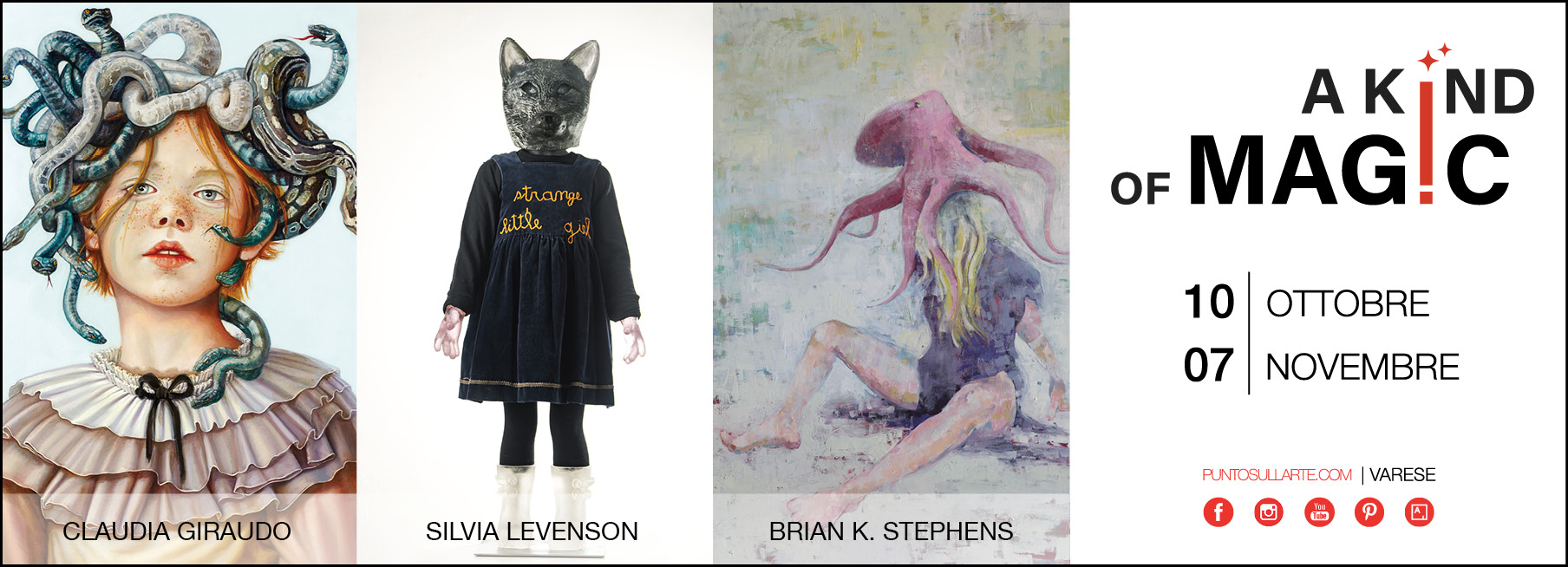 Tre artisti provenienti da tre Paesi diversi (Italia, Stati Uniti e Argentina) si incontrano per la seconda mostra della stagione di Punto Sull'Arte, una tripla personale tra atmosfere magiche e sguardi disincantati sulla realtà. Il Vernissage della tri-personale dal titolo A Kind Of Magic si terrà Sabato 10 Ottobre dalle 15 alle 20, solo su appuntamento.