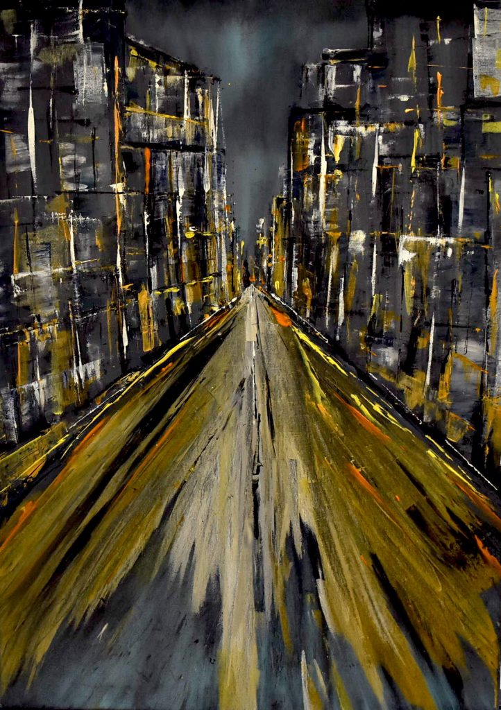 Il punto di fuga accelera e serra l’occhio del lancio di prospettiva nella direzione rettilinea della strada, a figurare la dimensione lineare del tempo della vita moderna, lontano dal tempo circolare della vita agreste, un tempo i cui istanti figli pascono dei padri, un tempo senza passato, che incolla all’illusione d’infinita perfettibilità del progresso tecnico-scientifico e che l’artista denuncia nella sua costitutiva giallastra corruttibilità, che depaupera il divenire, quando non si nutra della curvatura di senso di un eterno ritorno all’essere, di una rigenerazione naturale di vita, a vincere la vacuità di un presente di perdita.