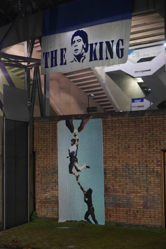 Il tributo artistico di Nello Petrucci a Maradona: “La mano de Dios”, un’opera di street art di circa 4 metri all'esterno della Curva B, dello Stadio San Paolo di Napoli.