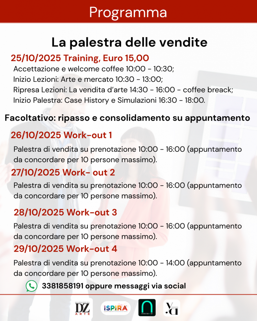 L’obiettivo è favorire un approccio maturo, professionale e consapevole alla vendita e alla promozione dell’arte, superando logiche improvvisate e riscoprendo la centralità della relazione e della cultura visiva.