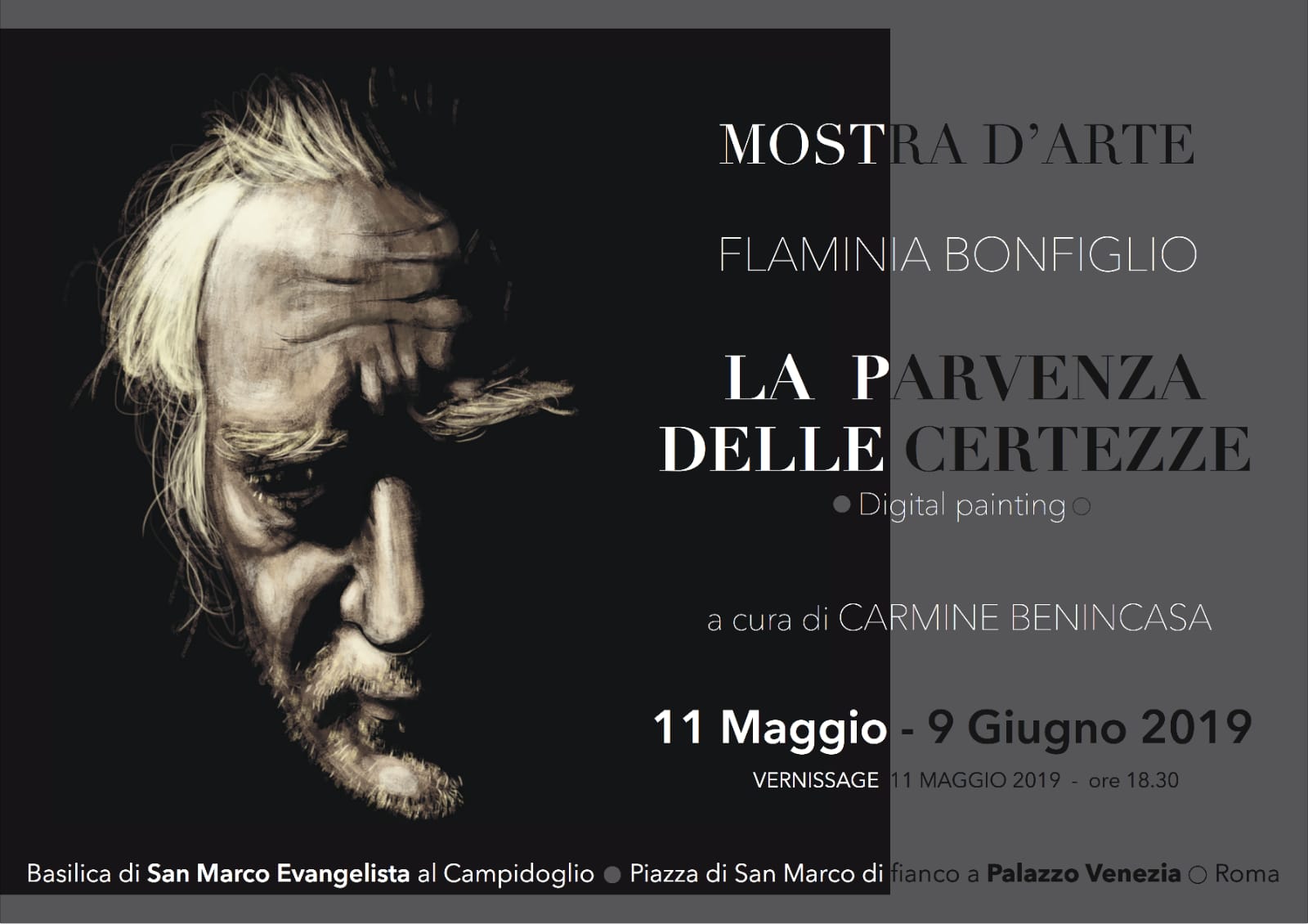L’11 maggio 2019 alle 18.30 Carmine Benincasa introduce la mostra d’arte La parvenza delle certezze, dell’artista romana Flaminia Bonfiglio, a cura dell’illustre Prof.Benincasa, presso la Basilica di San Marco Evangelista al Campidoglio in Piazza di San Marco. La mostra resterà aperta fino al 9 giugno per poi, successivamente, proseguire, ad Eboli.