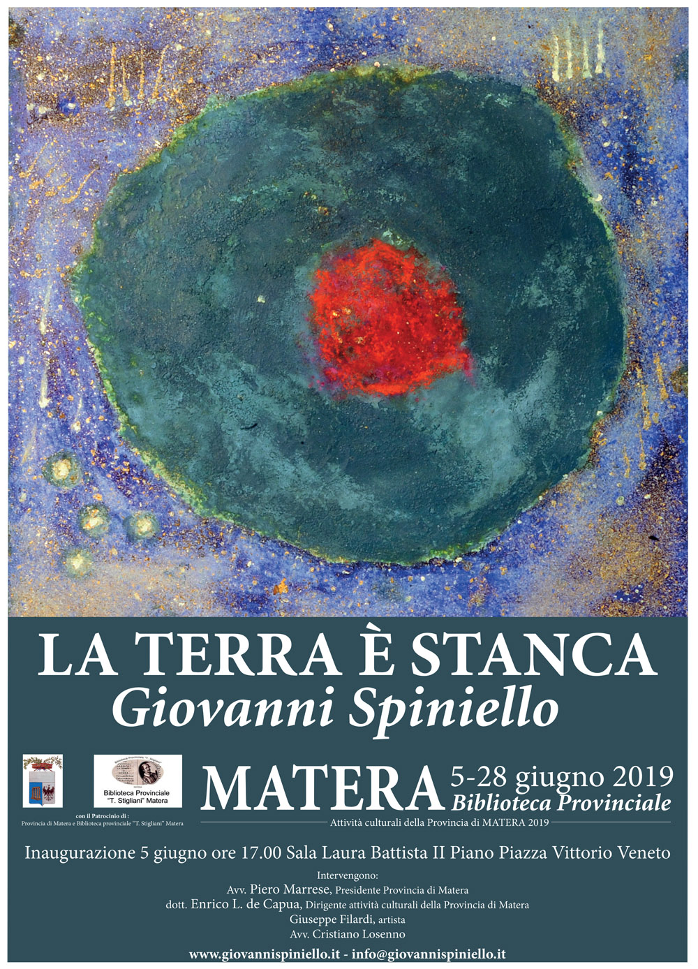 Giovanni Spiniello, scultore, pittore, incisore irpino, sarà a Matera dal 5 al 28 giugno nella Biblioteca Provinciale T. Stigliani con la sua personale "La Terra è Stanca" che ha il patrocinio della Provincia di Matera.