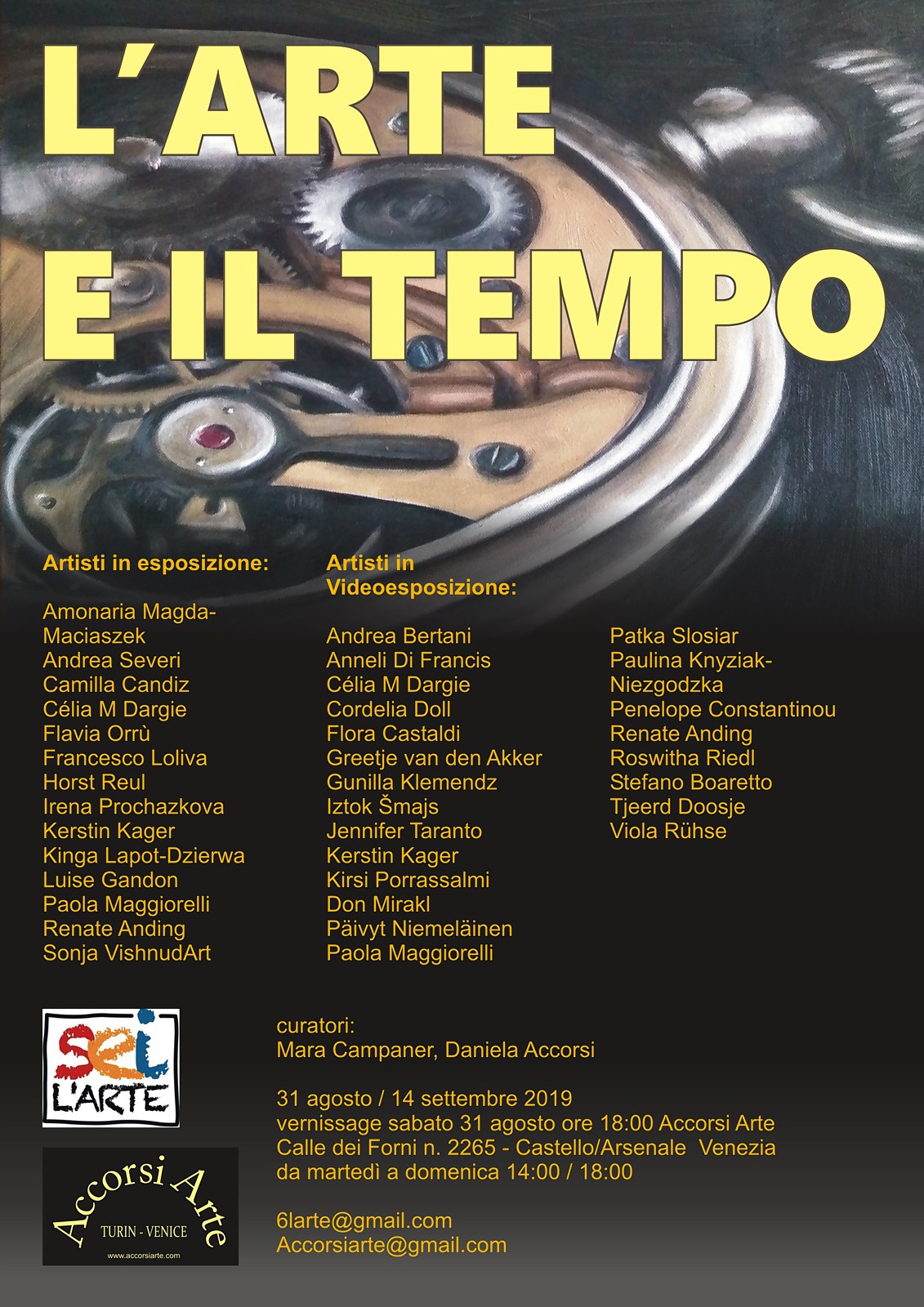 In questa mostra il tempo è presente in ogni opera d’arte come lo sono i soggetti. È sempre stato lì e molte volte non ce ne accorgiamo perché quando lo abbiamo sotto i nostri occhi non gli diamo il giusto peso. Spesso il tempo viene associato alla decadenza, alla morte alla sua perpetua scorrevolezza. Invece in questa mostra lo scopo è di renderlo vivo attraverso le opere degli artisti. Il tempo è il valore intrinseco di ogni opera di pittura, fotografia, grafica, acquarello e scultura; viene inserito nel loro operato, nei loro pensieri e nei dettagli dei soggetti.Il senso del tempo va oltre la percezione, quando ho pensato alla tematica di questa mostra da mettere in concomitanza alla Biennale mi sono venuti in mente il libro di Alice nel paese del meraviglie e al personaggio del Bianconiglio, per il quale il tempo era scandito dall’orologio che tirava fuori dal taschino mormorando “E’ tardi, è tardi!”. Dall’altra parte alle giornate sospese in cui il tempo sembra abbia dimenticato di trascorrere e le giornate sembrano infinite. Due opposti pensieri che all’interno della mostra comunicano tra di loro attraverso le opere degli artisti. Il tempo è così importante e presente nella vita e nell’immaginario delle persone, che per comprenderlo bisogna andare oltre la mera misurazione attraverso un orologio, ma si trasforma in vere e proprie opere d’arte che rappresentano la nostra società contemporanea con uno stile proprio senza tempo, dimostrando la capacità di trasformazione nelle varie rappresentazioni. Il tempo all’interno di questa mostra è visto come un gioiello che sa conquistare l’osservatore dimostrandosi versatile, nobile, democratico, lineare, pulito e curvilineo. Non è possibile per il visitatore affezionarsi a queste opere perché diventano come amuleti da custodire all’interno delle nostre case con il passare degli anni.