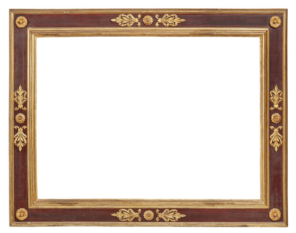Sono ben tre gli esemplari prodotti in Italia centrale che ci piace ricordare, il primo è una CORNICE del XVII secolo in legno laccato e dorato, con fiori e foglie stilizzati agli angoli e al centro dei lati, stimata 2.000/3.000 euro.